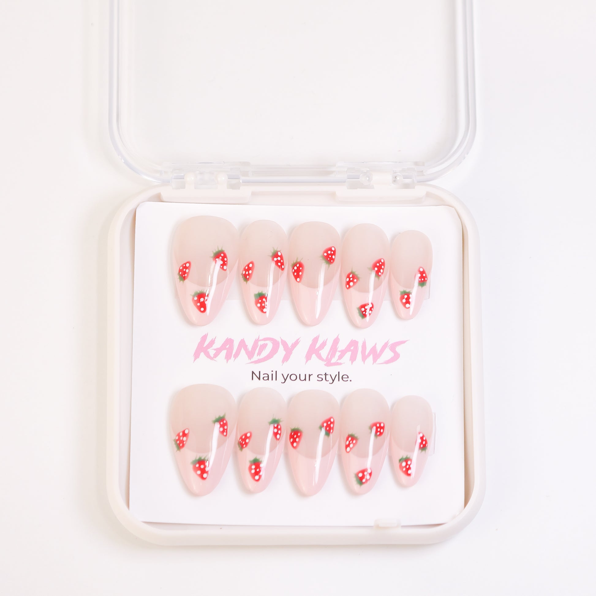 KANDY KLAWS™ 'STRAWBERRY FIELDS' - INSPIRED BY THE STRAWBERRY FIELDS IN SOUTHERN CALIFORNIA AND BLOOMCORE ASTHETICS. EACH NAIL FEATURES HAND PAINTED MINI STRAWBERRIES ON A PINK ELEGANT FRENCH TIP DESIGN THAT INSTANTLY TRANSPORT YOU TO A BUCOLIC SETTING WITH A DASH OF REFRESHING VIBES. EACH SET IS HANDCRAFTED WITH LOVE AND A SPRINKLE OF MAGIC AND THEY ARE SURE TO TURN HEADS. DIVE INTO OUR "FAIRYDUST COLLECTION" TODAY AND LET YOUR NAILS DO THE TALKING.